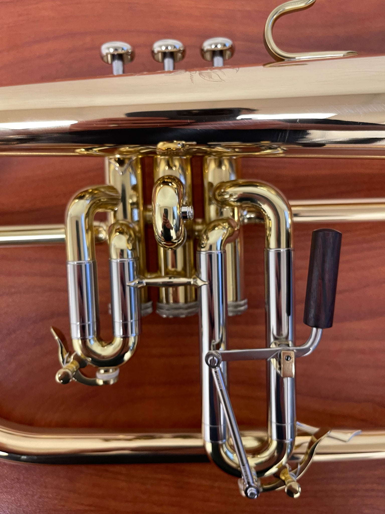 The .437" bore and 6" hand-hammered gold brass bell give the horn a warm, shapely sound with a clear core that doesn’t disappear in the mix. The traditionally brazed bell seam, soldered bead, and gold brass first branch add complexity and stability, so your sound stays full and connected from the softest ballad to the top of the staff. A yellow brass leadpipe bit with a Large Morse taper offers excellent compatibility with modern mouthpieces and a fast, predictable response.